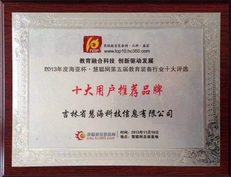 历时近4个月,经过用户网络投票与专家评审的层层评定,吉林省慧海科技凭借卓越的产品品质、完美的服务体系以及优质的用户体验获得了2013年度海亚杯·第五届教育装备行业 “十大用户推荐品牌”的殊荣。