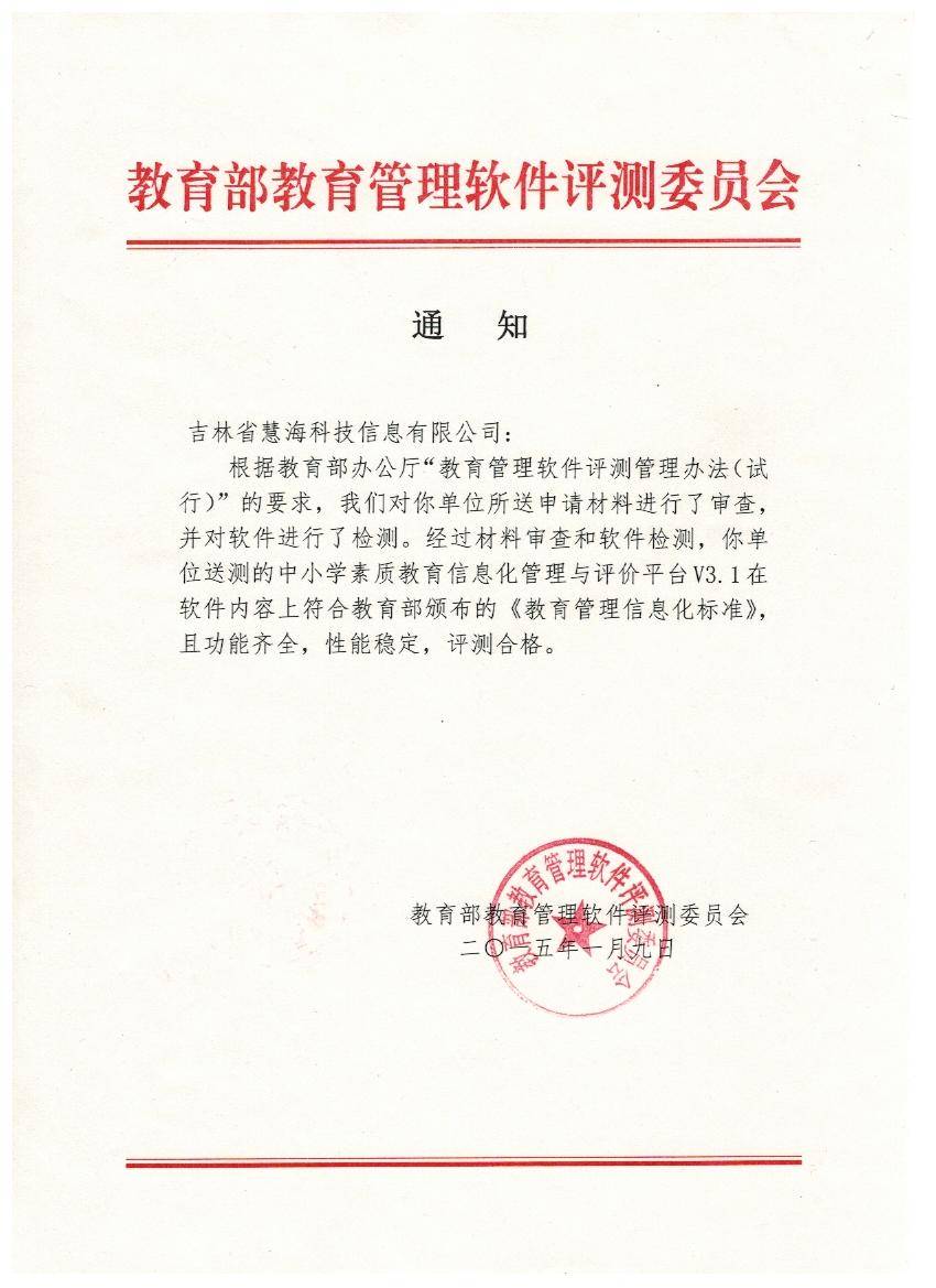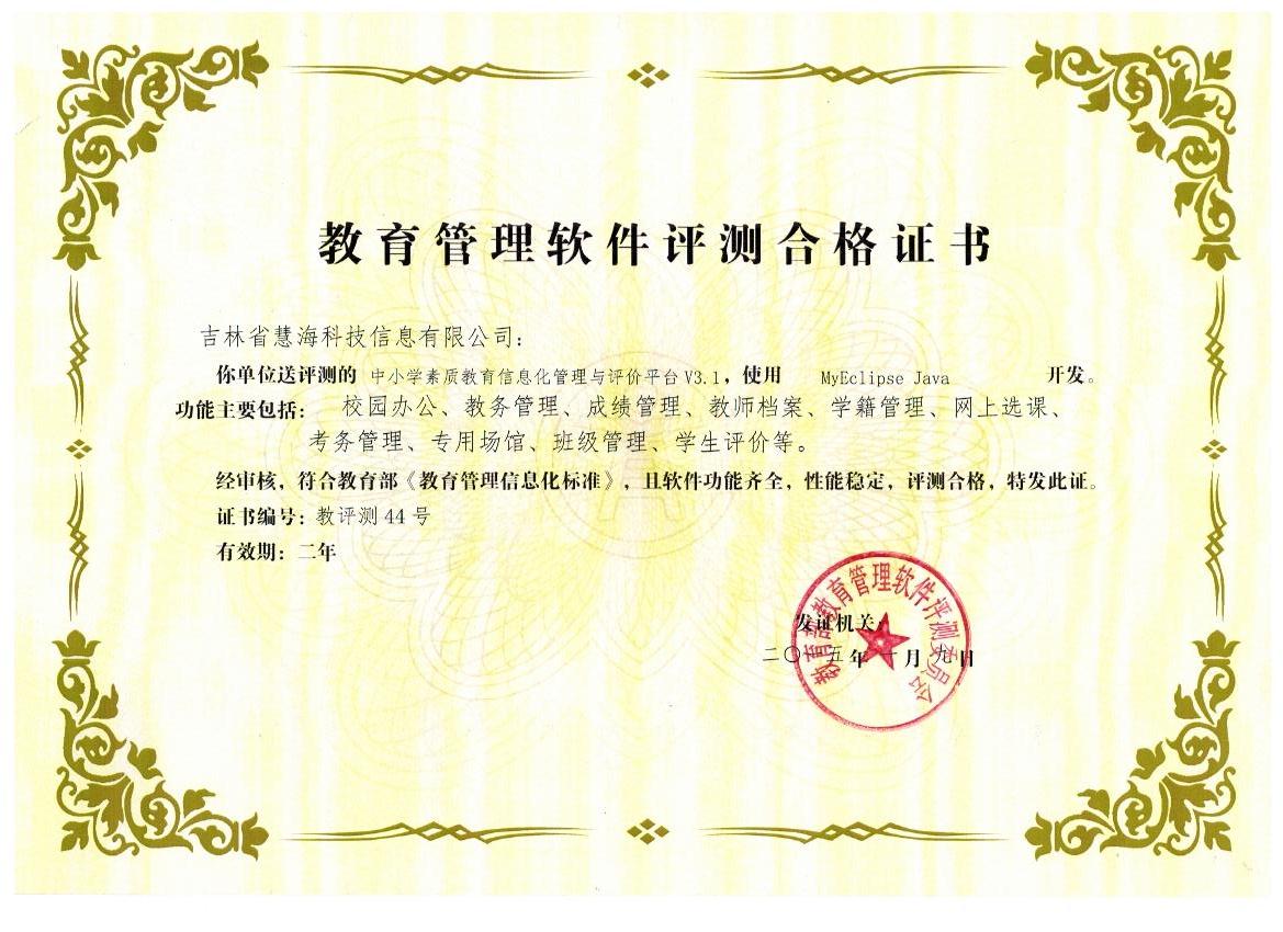 近年来,教育部对规范全国教育管理信息化工作一直高度重视,并多次强调要求学校各级教育行政部门、各级各类学校必须使用通过评测符合《教育管理信息化标准》的教育管理软件。2015年1月9日, 教育部教育管理软件评测委员会授予吉林省慧海科技信息有限公司《教育管理软件评测合格证书》,并明确指出“中小学素质教育信息化管理与评价平台V3.1符合《教育管理信息化标准》,且软件功能齐全,性能稳定”。该证书的获得充分说明了吉林慧海的软件产品质量过硬,技术先进,为二代产品《慧海素质教育评价云平台》的问世打下了坚实的基础。未来慧海定将带着这份荣誉与肯定继续为教育管理信息化、现代化贡献力量,履行为教育助航的使命。