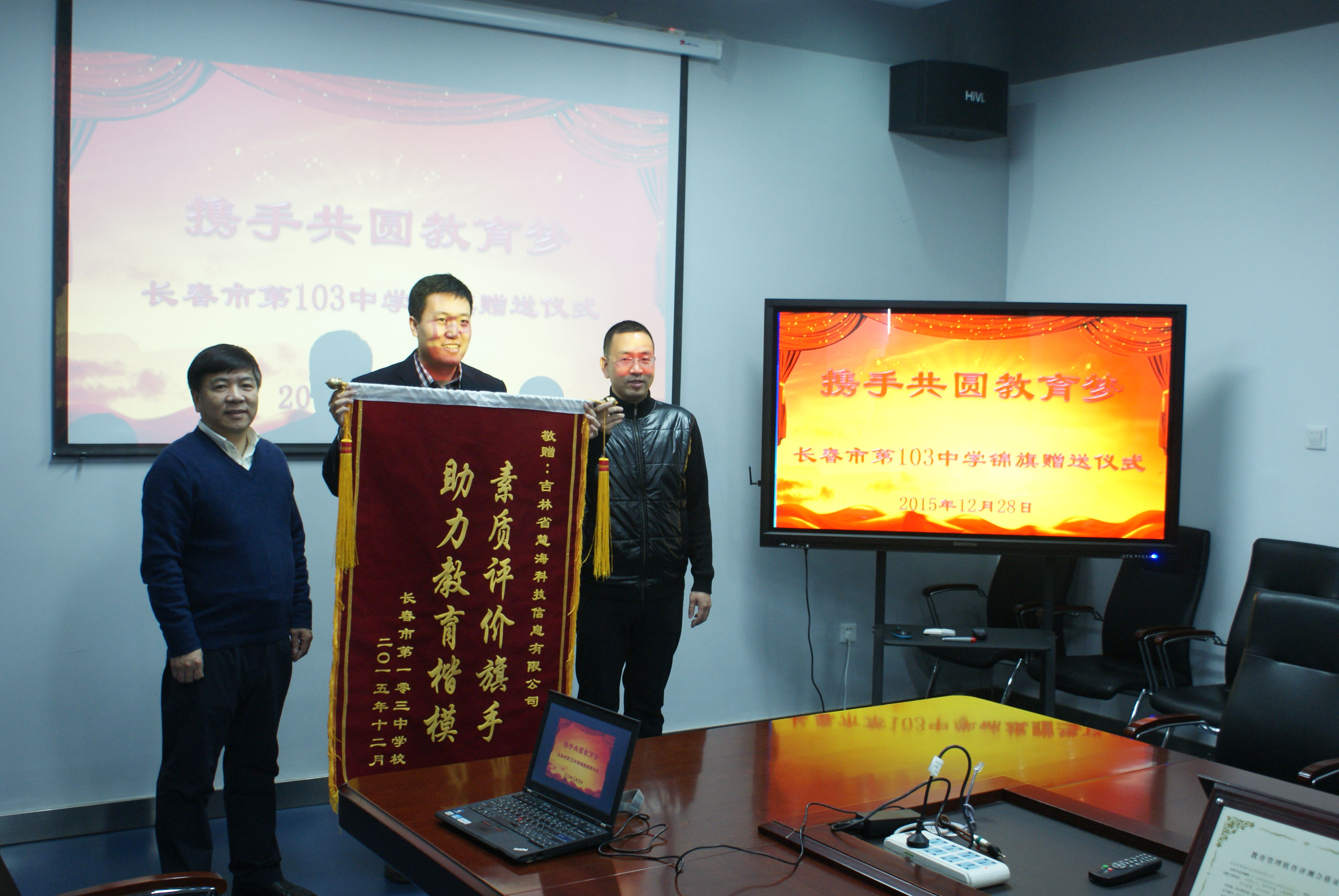 2015年12月28日下午,长春市103中学信息办主任王雨将印着“素质评价旗手 助力教育楷模”的锦旗送到慧海科技信息有限公司郑彦臣总经理的手中。